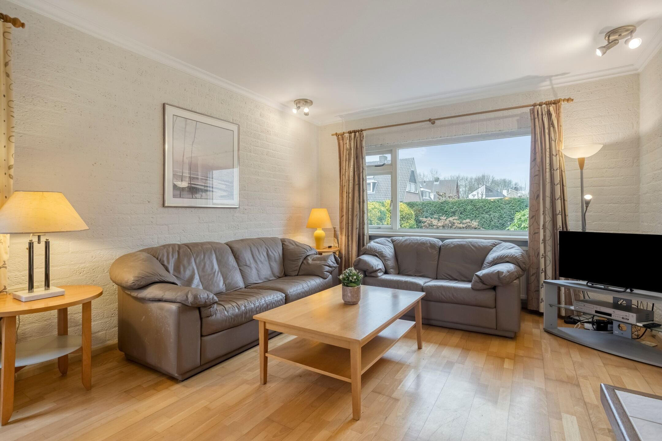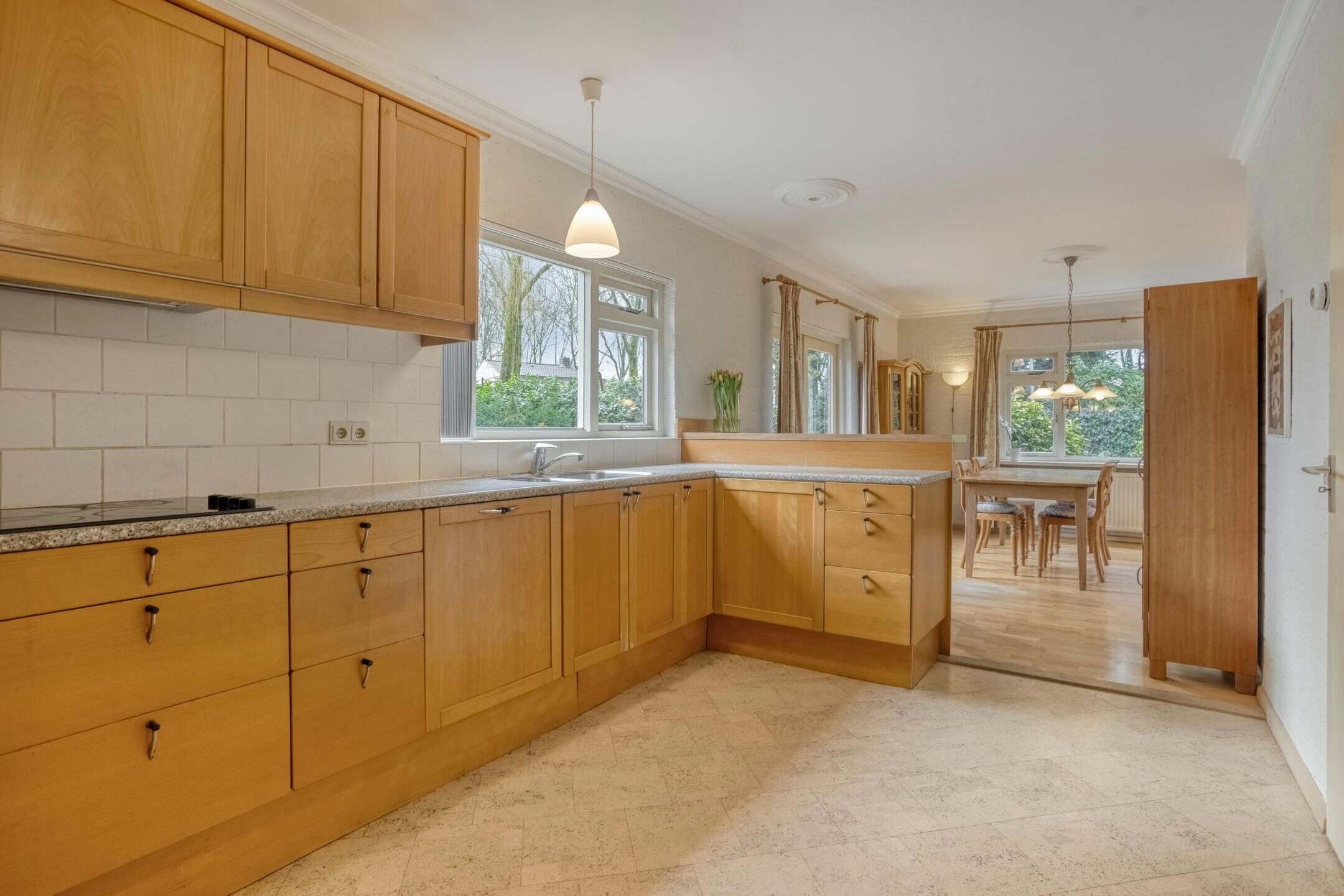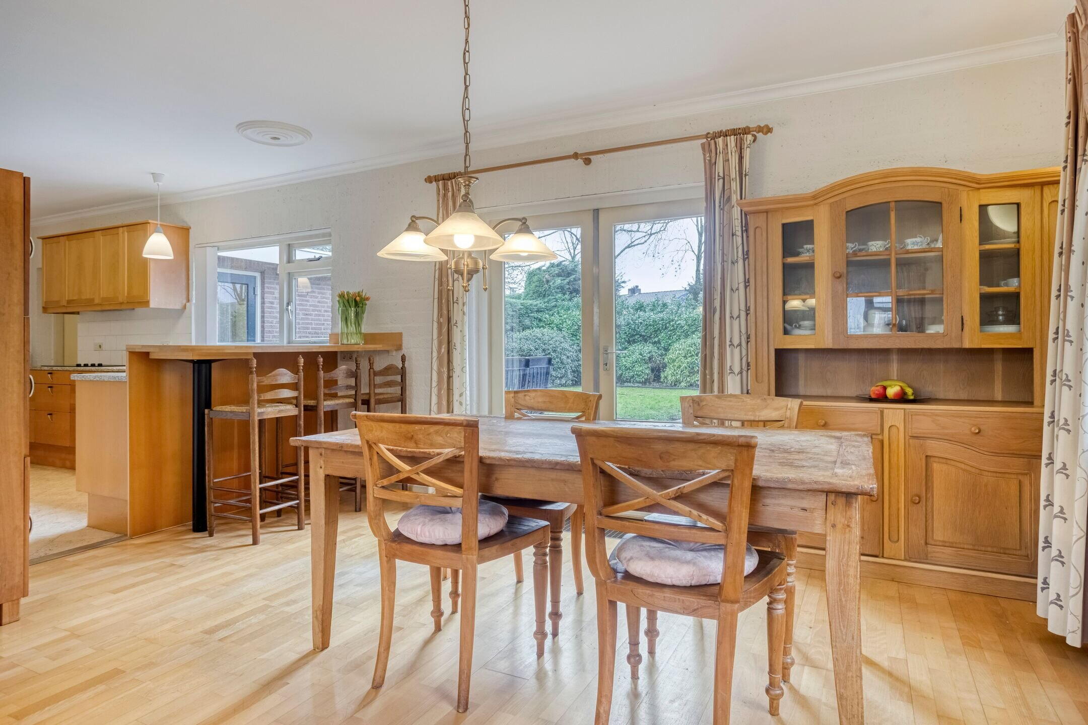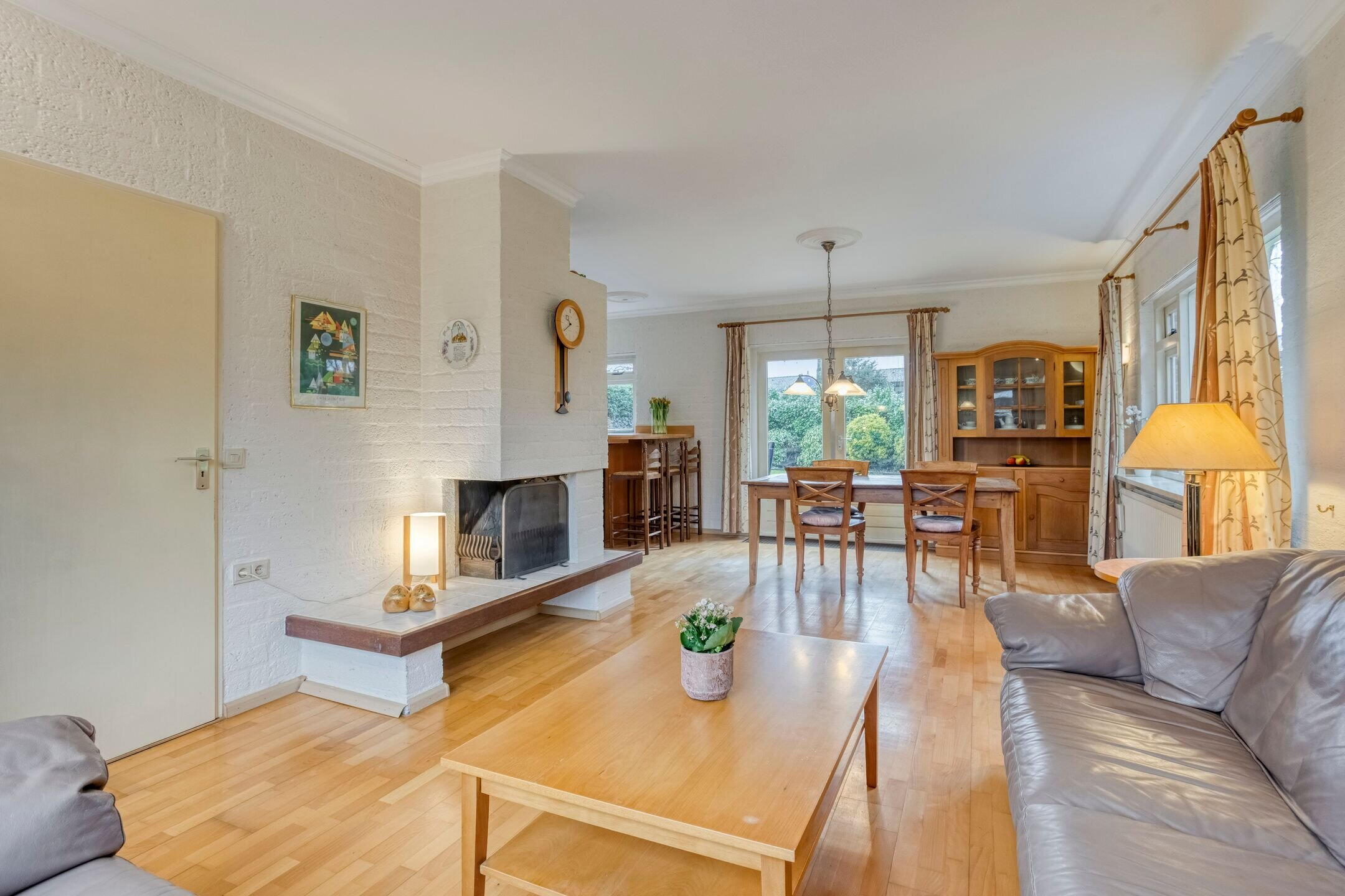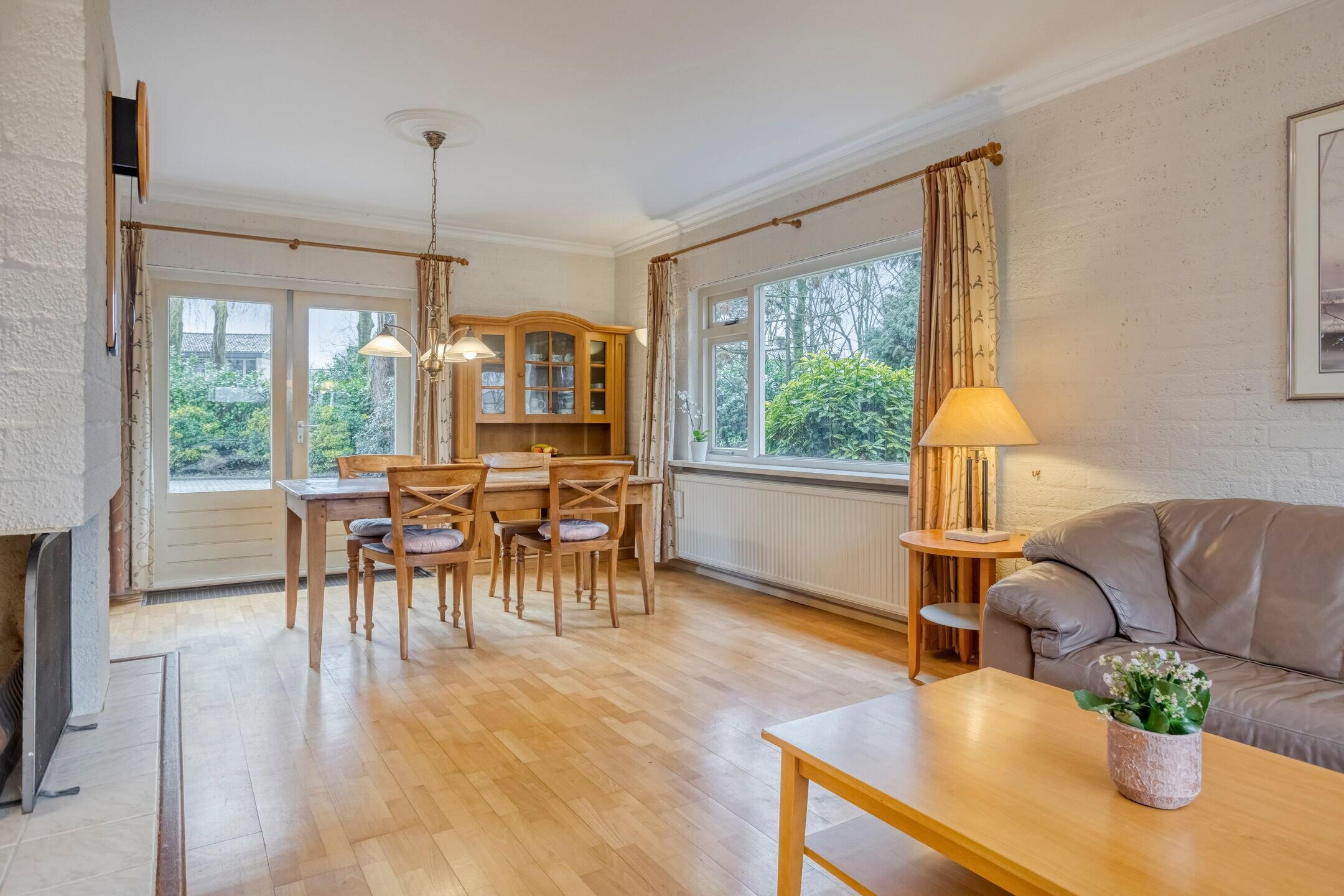 De tuingerichte woonkamer is voorzien van een zithoek, eethoek, openslaande tuindeuren en een open haard. Dankzij de grote raampartijen aan drie zijden biedt deze ruimte een lichte en aangename leefomgeving met direct zicht op het terras en de zonnige achtertuin.